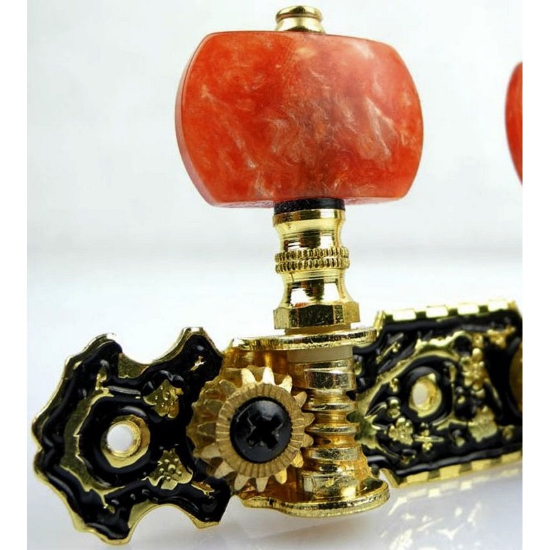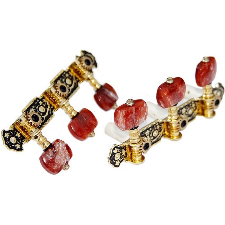 AOS-020HV2P - открытые колки для классической гитары от компании Alice. Они установлены на стильную позолоченную стальную лиру с чернением, а закругленные ручки выполнены из прочного пластика цвета "красный перламутр". Такие колки обеспечивают быструю, точную настройку, отлично держат строй, могут похвастаться продолжительным сроком службы, а также станут прекрасным штрихом, дополняющим внешний вид вашего инструмента.