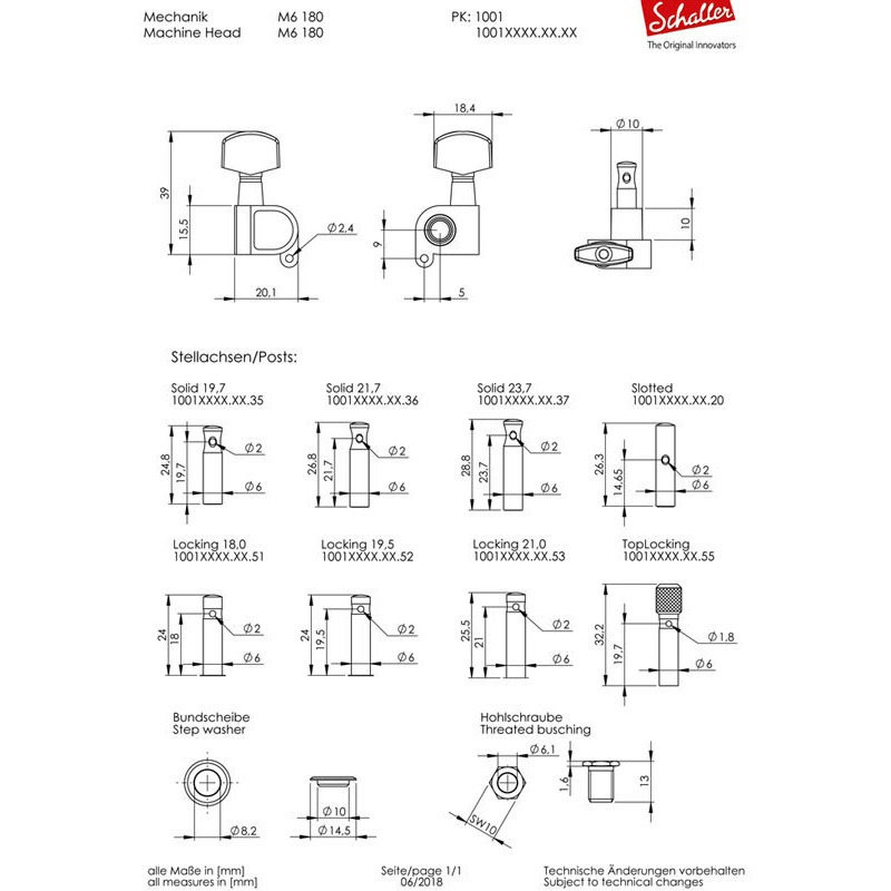 Комплект одиночной колковой механики SCHALLER 10010223.02.36 M6 180