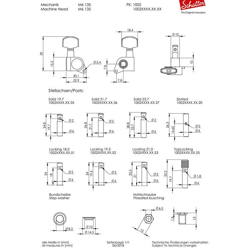 Комплект одиночной колковой механики SCHALLER 10030420.01.50