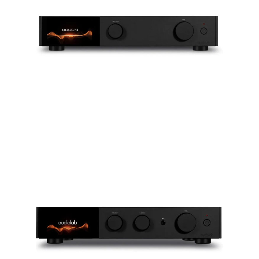 Это комплект из двух устройств: интегрального усилителя 9000A и сетевого аудиоплеера 9000N, объединённых в единую систему для воспроизведения аудио высокого разрешения. Оба компонента выполнены в чёрном цвете и относятся к флагманской серии 9000 британского производителя Audiolab