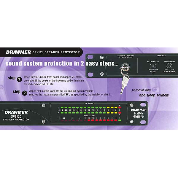 Новое устройство защиты громкоговорителей Drawmer SP2120 предлагает как строгий контроль за уровнем, так и гарантию для контрактора или инсталлятора, что ключ доступа есть только у обслуживающего инженера и управляющего. Из названия ясно, что данный двухканальный процессор высотой 1U исключает возможность появления неразрешенных избыточных уровней звукового давления в системе звукоусиления, которые могут привести к повреждению драйверов и электроники усилителя. Прибор также предоставляет возможность разнообразным концертным площадкам, клубам, театрам, барам, школам, университетам и т.п., соблюдать местное законодательство, касающееся уровня шума.
