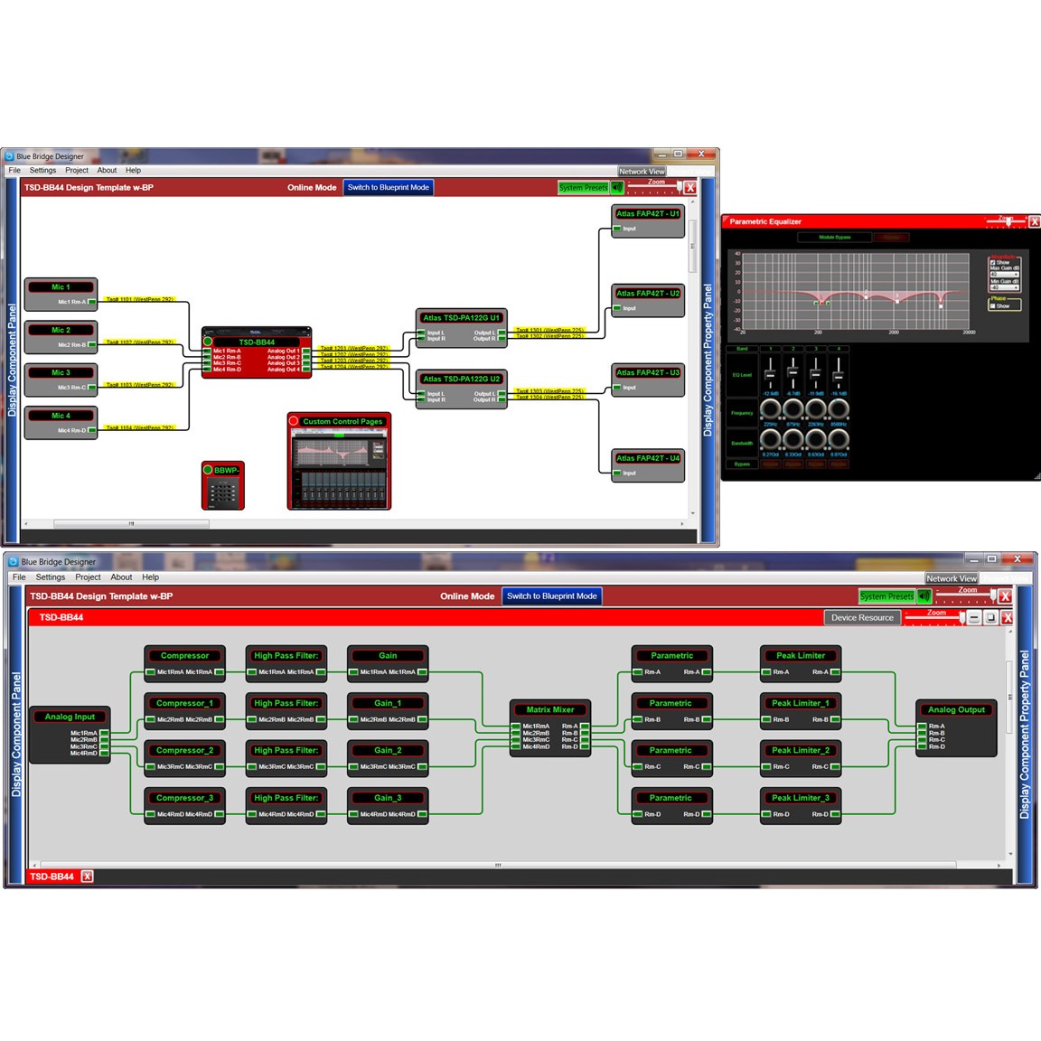 BB-816 – 8-канальный цифровой аудиопроцессор с 16-ю выходами, предназначенный для самых различных приложений: видеоконференций, озвучивания презентаций, мультизонных систем и т. д. Семейство аудиопроцессоров BlueBridge от Atlas Sound, к которому относится BB-816, имеет открытую архитектуру. Бортовой DSP-чип осуществляет вычисления с разрядностью 40 бит с плавающей точкой, обеспечивая максимально быструю и корректную обработку сигналов. При подключении к сети процессор получает собственный МАС-адрес и может управляться через Интернет. Параметры цифро-аналоговых преобразователей – 24 бит/48 кГц. В цепях предварительного усиления для микрофонных входов используются высококачественные операционные усилители THAT Corp. Предусмотрено фантомное питание ±48 В, переключаемое с помощью программного обеспечения. Аудиопроцессор обладает функциями микширования аудиосигналов, осуществляет временную обработку и частотную коррекцию сигнала с помощью цифровых фильтров различных типов (6-48 дБ/октаву, Линквиц — Райли, Баттерворт, Бессель) и цифрового параметрического эквалайзера. Имеется цифровой генератор тестовых сигналов (тонального, свип-тона, белого, розового шума), предусмотрена коррекция динамического диапазона (компрессор-лимитер-экспандер). Корпус аудиопроцессора изготовлен из алюминиевого сплава черного цвета, в рэковом варианте, и занимает высоту 1U. Входы и выходы на задней панели реализованы на клеммных колодках типа Phoenix, предусмотрено 4 логических входа/выхода, сетевой вход (RJ-45). На лицевой панели имеется светодиодная индикация сигналов на входах и выходах.