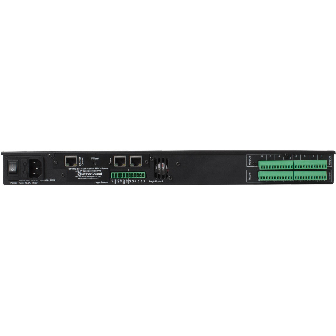 BB-88 – 8-канальный цифровой аудиопроцессор, предназначенный для самых различных приложений: видеоконференций, озвучивания презентаций, мультизонных систем и т. д. Семейство аудиопроцессоров BlueBridge от Atlas Sound, к которому относится BB-88, имеет открытую архитектуру. Бортовой DSP-чип осуществляет вычисления с разрядностью 40 бит с плавающей точкой, обеспечивая максимально быструю и корректную обработку сигналов. При подключении к сети процессор получает собственный МАС-адрес и может управляться через Интернет. Параметры цифро-аналоговых преобразователей – 24 бит/48 кГц. В цепях предварительного усиления для микрофонных входов используются высококачественные операционные усилители THAT Corp. Предусмотрено фантомное питание ±48 В, переключаемое с помощью программного обеспечения. Аудиопроцессор обладает функциями микширования аудиосигналов, осуществляет временную обработку и частотную коррекцию сигнала с помощью цифровых фильтров различных типов (6-48 дБ/октаву, Линквиц — Райли, Баттерворт, Бессель) и цифрового параметрического эквалайзера. Имеется цифровой генератор тестовых сигналов (тонального, свип-тона, белого, розового шума), предусмотрена коррекция динамического диапазона (компрессор-лимитер-экспандер). Корпус аудиопроцессора изготовлен из алюминиевого сплава черного цвета, в рэковом варианте, и занимает высоту 1U. Входы и выходы на задней панели реализованы на клеммных колодках типа Phoenix, предусмотрено 4 логических входа/выхода, сетевой вход (RJ-45). На лицевой панели имеется светодиодная индикация сигналов на входах и выходах.