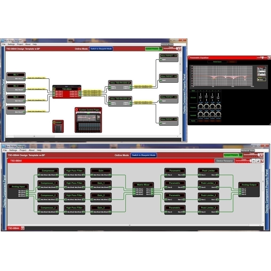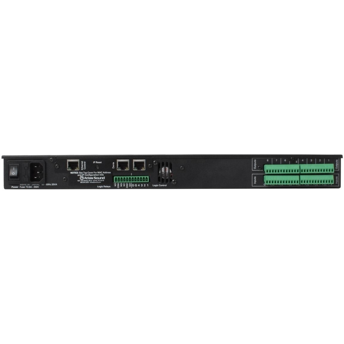 Atlas IED BB-88DT – 8-канальный цифровой аудиопроцессор с поддержкой Dante. Линейные входы с программным переназначением на микрофонные входы. Микрофонные предусилители THAT Corp. Фантомное питание ±48 В. Цифровой генератор сигналов, частотная коррекция, параметрический эквалайзер, временная задержка 10-2000 мс. Управление через TCP/IP. Параметры АЦП/ЦАП – 24 бит/48 кГц.