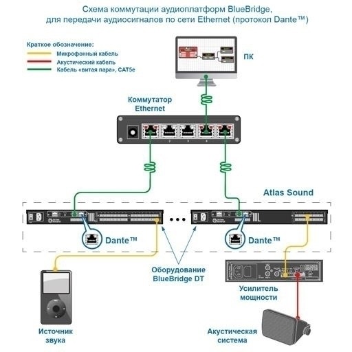 - Технология Dante позволяет организовать передачу управляющих сигналов и цифровых аудиосигналов по отдельной локальной сети