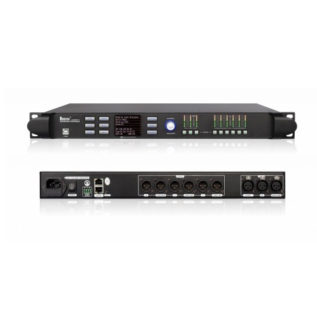 Высокопроизводительный цифровой аудиопроцессор (на базе процессора TI OMAP-L138 3648 с вычислительной мощностью до 3648 MIPS и 2746 MFLOPS операций в секунду) 3 входа 6 выходов с частотой дискретизации 96 кГц, 32-бита. 24-х битные преобразователем AD/ DA с высокоскоростной обработкой DSP. 16-ти полосный эквалайзер с возможностью выбора: parametric eq, notch, all pass 1-st, all pass 2-nd, high shelf, low shelf для каждого входного и выходного каналов. HPF и LPF на каждом канале. Максимальная устанавливаемая задержка сигнала до 2000 ms на каждом канале. На входных каналах input compressor, nose gate, test signal generator. На выходных каналах FIR filter, output limiter. Свободная маршрутизация сигналов. Контроль и управление c помощью специализированного ПО по протоколу TSP/IP, а также через USB-порт.