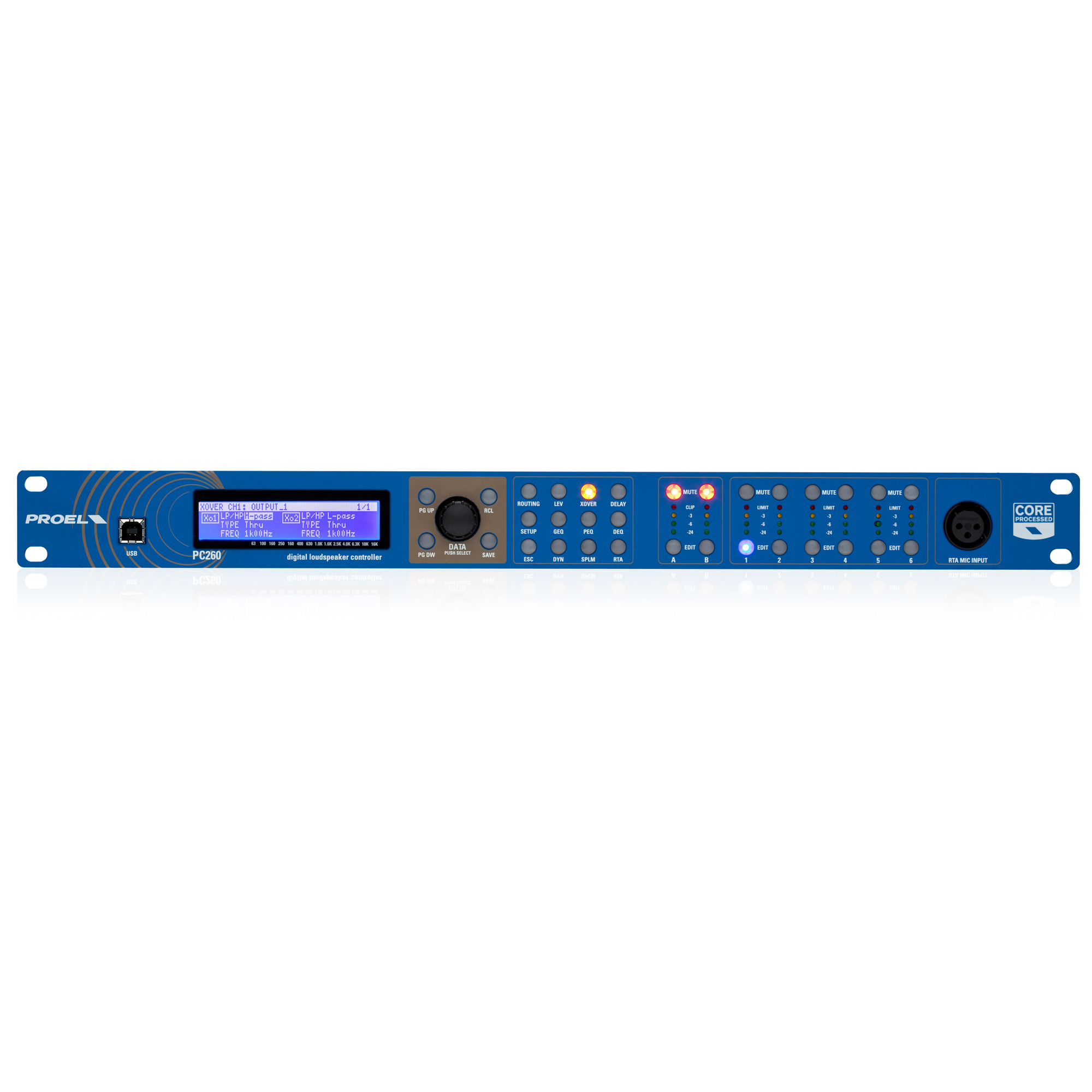PROEL PC260 — Цифровой процессор на платформе Core DSP позволяет обрабатывать звуковой сигнал, оптимизируя производительность системы в целом. Использование даже сложных функций процессора интуитивно понятно, благодаря удобству пользовательского интерфейса с прямым доступом ко всем функциям редактирования и удаленным управлением. Процессор обладает рядом особенностей, таких как программируемый уровень управления звуковым давлением (SPLM), благодаря использованию внутренних часов, и полное удаленное управление всеми функциями с подключенного ПК.
