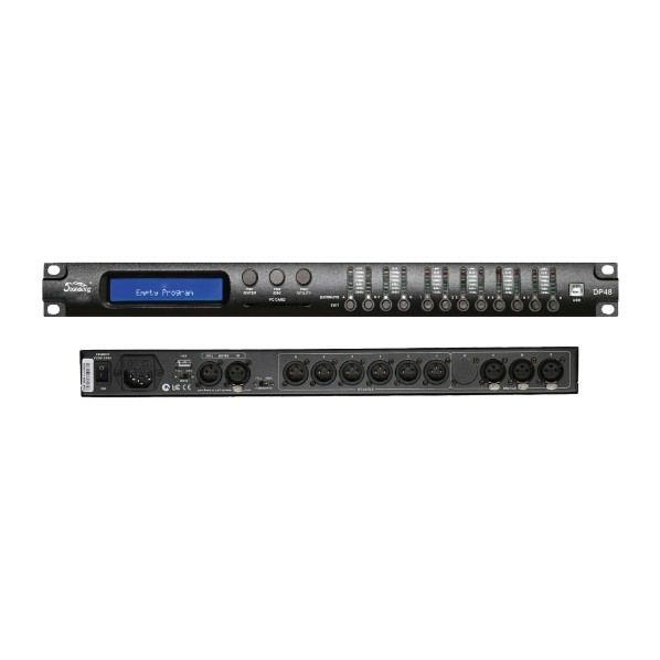 Soundking DP48 - многофункциональный процессор аудио эффектов с 4 входами и 8 выходами. Прекрасно подходит как для поддержания постоянных инсталляций, так и для выступлений живого формата. Оборудованный 24-битными преобразователями, процессор гарантирует прекрасное качество звучания. Филигранная обработка аудио сигнала с удвоенной точностью вместе с 24-битным преобразованием обеспечивает динамический диапазон > 110 дБ. DP48 оснащен встроенными 30 фильтрами на каждый вход и 7 на каждый выход. Усиление фильтров Bell и Shelving изменяется в диапазоне от -15 дБВ до +15 дБВ с шагом 0.5 дБВ. Основные особенности: процессор эффектов с 4 выходами и 8 входами; входная обработка : Gain,Mute,Noise gate,high-cut,low-cut,8 parameter EQ,Phase,Delay; выходная обработка: crossover,5 parameter EQ,Gain,Mute,compressor/Limitor,Phase,Delay; простое и понятное меню всех параметров и настроек; встроенный тон-генератор и большой LCD-дисплей; 32 пользовательских пресета с возможностью установить защиту паролем; комплект ПО для ПК, подключение по USB или RS232.