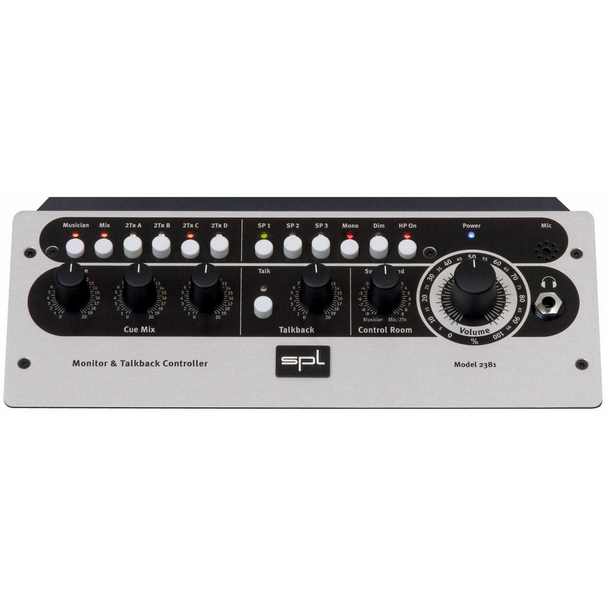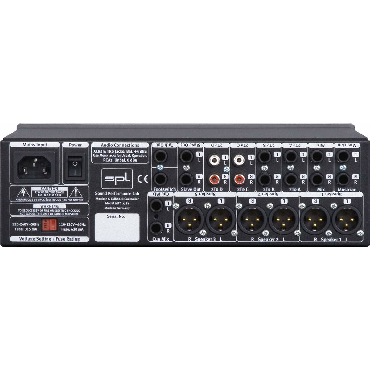 Мониторный контроллер с переговорной системой SPL MTC имеет 2 симметричных входа для мониторинга записываемого сигнала, 2 симметричных входа для мониторинга микса, две пары симметричных входов и две пары несимметричных входов для двухдорожечных устройств, три пары симметричных линейных выходов для акустических систем, кнопки выбора пары входов и пары выходов, пару дополнительных симметричных выходов (на них поступает сумма всех активных входов, кроме входа для исполнителя), выход для наушников на передней панели с кнопкой включения.