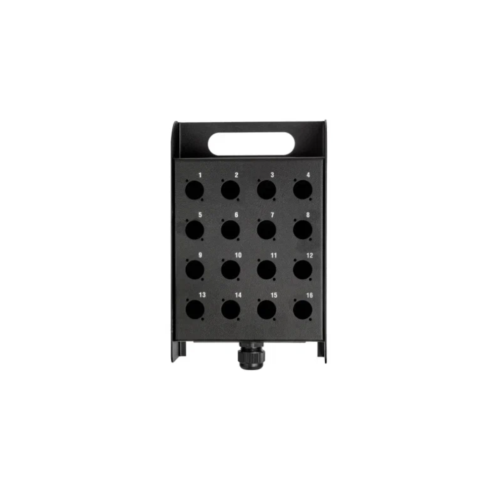 Сценический короб для коммутации с 16 отверстиями под разъёмы с фланцем типа D. Предназначен для организации подключений на сцене или в других сценических пространствах