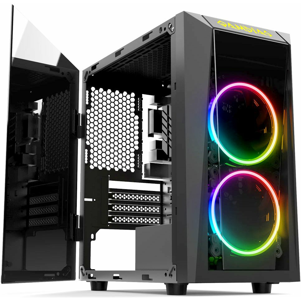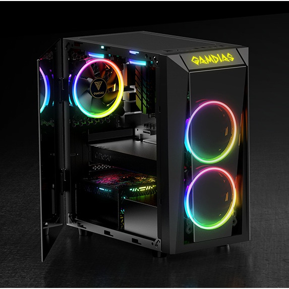 Корпус Gamdias для игрового ПК TALOS E1 (mATX/glass/2 RGB Sync fans) компактный для игрового компьютера с 2-мя панелями из затемнённого закаленного стекла, с распашной боковой дверцей и предустановленными RGB вентиляторами.