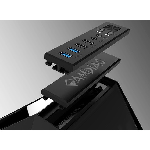 На панели ввода/вывода находятся кнопки управления оборотами вентилятора, управление 55-ю RGB режимами и выключение подсветки. А так же 2 порта USB 3.0, 2 порта USB 2.0, аудиовыход и вход для микрофона, кнопки и индикаторы питания и перезагрузки системы. Возможность установки панели ввода/вывода в верхнее или нижнее положение для удобного доступа к портам, независимо от размещения компьютера.
