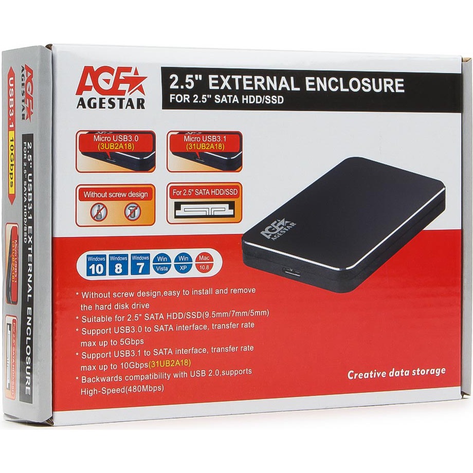 Внешний бокс AGE STAR 3UB2A18 прост в эксплуатации: это устройство может принести пользу пользователю любого уровня квалификации. Модель предназначена для совместного использования с 2.5-дюймовыми накопителями, причем вы сможете использовать как HDD, так и твердотельные накопители. Интерфейс подключения HDD и SSD – SATA. Преимуществом внешнего бокса является отсутствие необходимости использования крепежных элементов, а именно – винтов. Установка накопителя занимает считанные секунды. Очень быстро осуществляется и подключение внешнего бокса к портативному или стационарному компьютеру. Поддержка интерфейса USB 3.0 гарантирует очень высокую скорость обмена данными. Предусмотрена и обратная совместимость: вы также сможете задействовать порты USB 2.0.