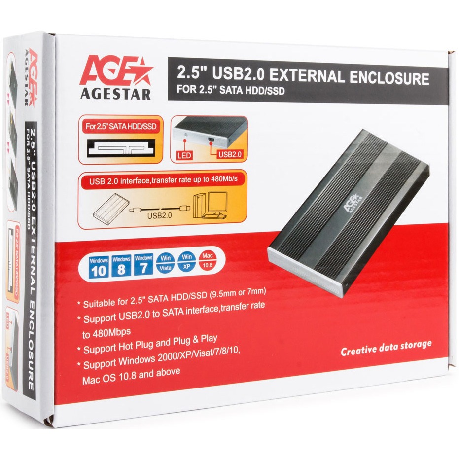 AgeStar SUB2S - внешний корпус для работы с жёсткими дисками форм-фактора 2.5 дюйма с интерфейсом Serial ATA (SATA) посредством интерфейса USB. Возможность "горячего" подключения и отключения (Hot-Plug) во время работы компьютера, автоматическое обнаружение подключённого диска операционной системой (Plug & Play). Для удобства снятия и закрепления крышки корпуса и жёсткого диска в посадочном месте в комплект поставки входит малогабаритная отвёртка.