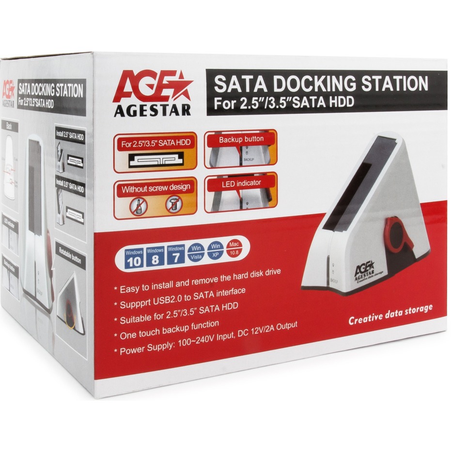 На задней панели Agestar SUBT находится интерфейс USB2.0 со следующими параметрами производительности – передачей данных 480 Мбит/с. Кредл имеет возможность резервного копирования. Прилагается в комплекте поставки внешний блок питания, кабель USB2.0. Питание устройства от сети. Конфигурация станции имеет оригинальную форму, есть отсек для установки дисков, интерфейс поддерживаемых HDD SATAII.