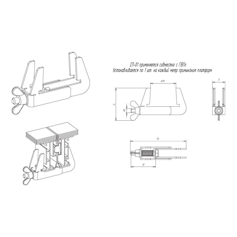 Соединитель платформ СП-01 применяется для жесткой фиксации платформ сцены между собой. СП-01 применяется совместно с ГВПл. Устанавливается по 1 шт. на каждый метр примыкания платформ.