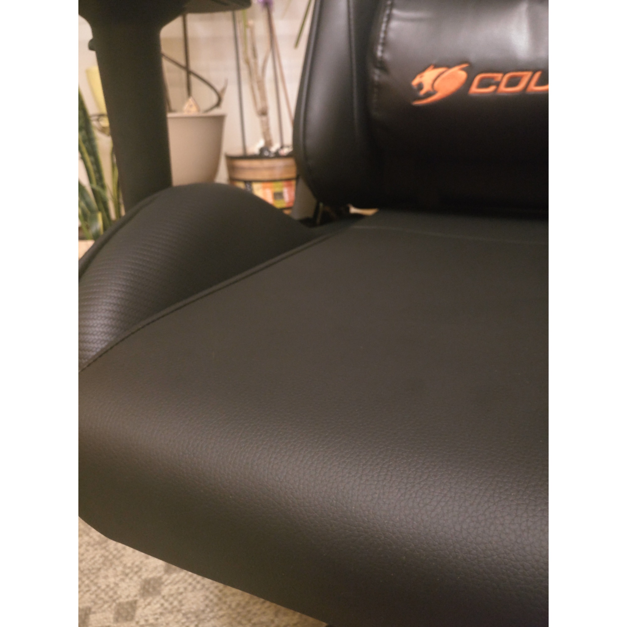 В верхней части спинки кресла расположен брендовый логотип компании Cougar, который был не напечатан на поверхности, а скрупулезно вышит прочными нитками.