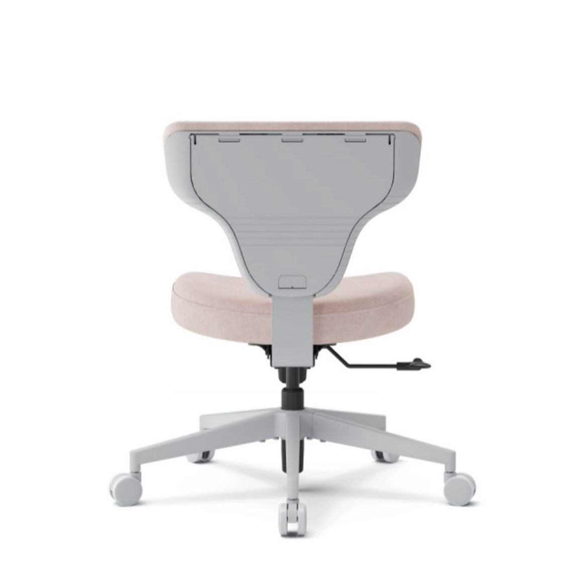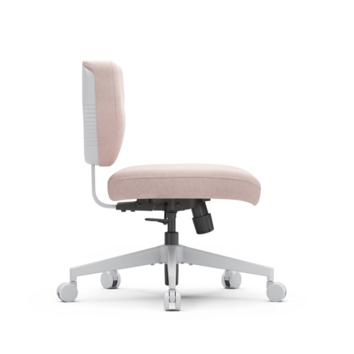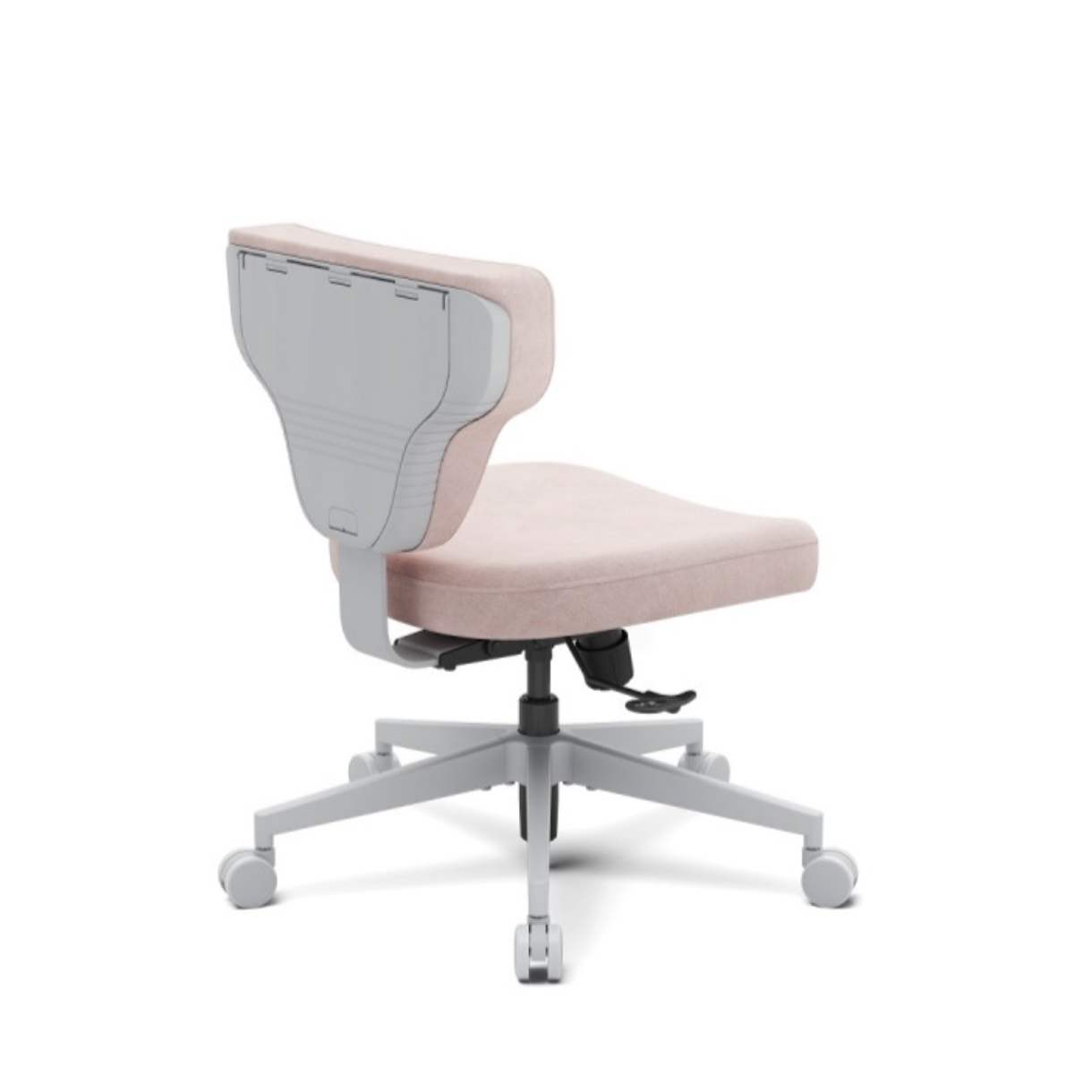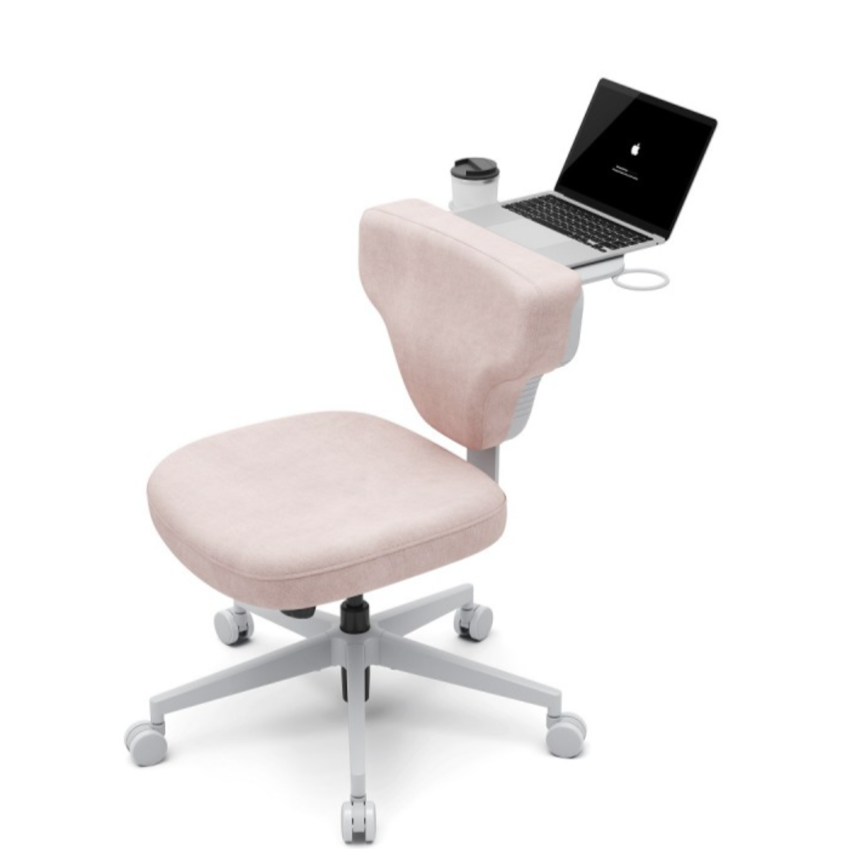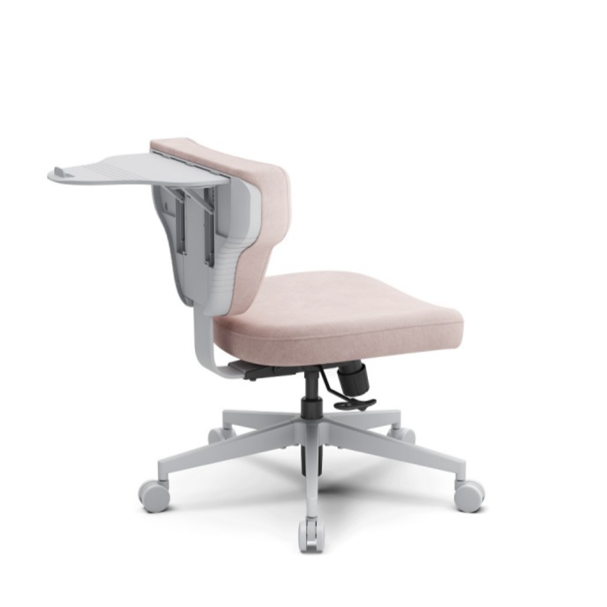 Это кресло гибридной посадки модели SHORTZ Fabric, размер 1, с ноутбучным столиком и розовой обивкой