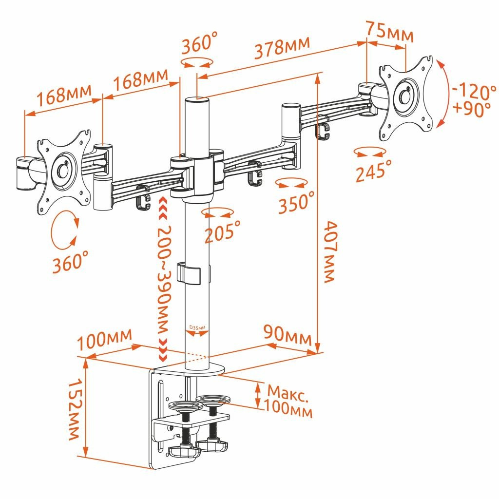Надежное крепление на край стола или любую другую поверхность, шириной до 100 мм, благодаря струбцине. Такое крепление дает возможность перенести кронштейн с мониторами в любое место без особых усилий, а благодаря противоскользящим накладкам не оставит следов на поверхности.