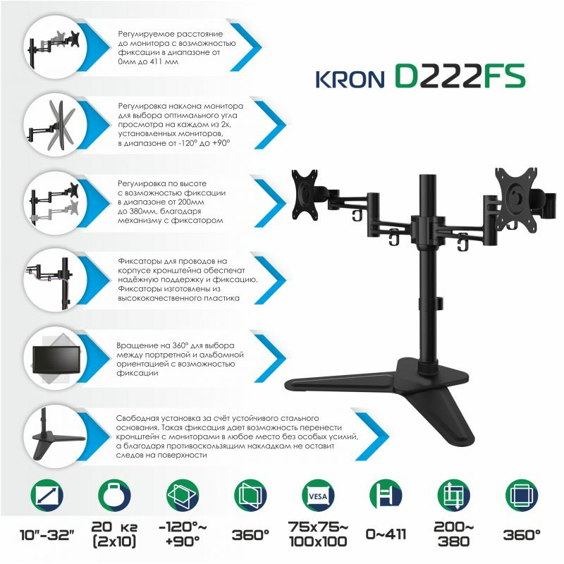 Кронштейн для двух и более дисплеев Kron D222FS Black