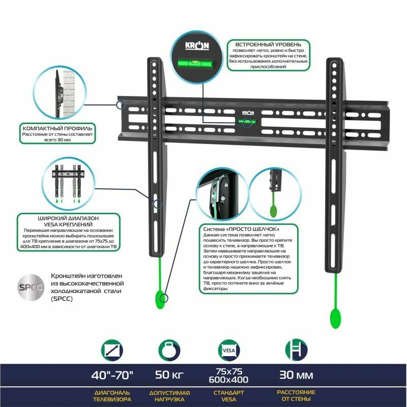 - СИСТЕМА ПРОСТОЙ ЩЕЛЧОК. Теперь есть возможность легко повесить и снять телевизор с кронштейна. Вы крепите основание кронштейна к стене и прикручиваете направляющие к телевизору, с их помощью вешаете телевизор на основание кронштейна. Теперь просто прижимайте телевизор к основанию кронштейна до характерного щелчка. Все, телевизор надежно закреплен. Чтобы снять телевизор - просто потяните вниз за зеленые фиксаторы и можно будет свободно снимать телевизор с основания кронштейна.