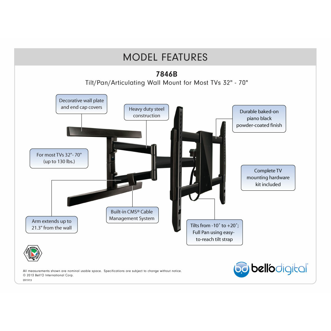 BellO 7846 Black. Универсальный кронштейн для подвеса плоскопанельных (LED, LCD) телевизоров, размером 32"-70". Макс. вес телевизора 59 кг. Поворот по горизонтали до 180° вправо-влево. Наклон по вертикали от -3° до 15°. Мин. расстояние при настенном монтаже 58 мм. Макс. выдвижение 541 мм. Толстостенная сталь, прецизионные компоненты и прочное порошковое покрытие. Низкий профиль. Предназначен для установки телевизора максимально близко к стене и его выдвижения для поворота и наклона.