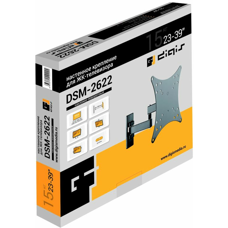 Digis DSM-2622 - наклонно-поворотный кронштейн для телевизора или монитора с диагональю экрана до 39 дюймов (99 см) и максимальным весом до 15 кг.