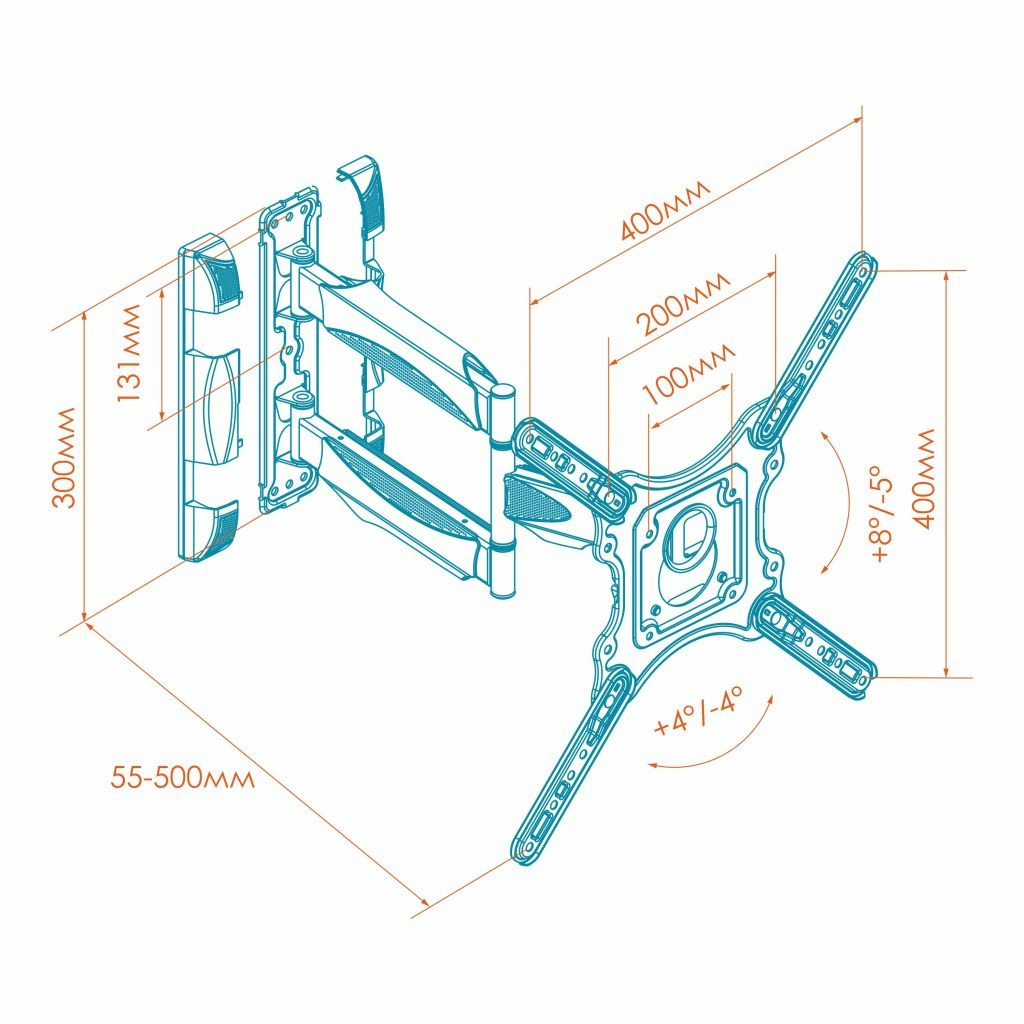 - ЛЁГКАЯ РЕГУЛИРОВКА НАКЛОНА. Надёжная конструкция без особых усилий позволит осуществить наклон даже тяжёлого телевизора лёгким движением на угол от -5 ° до +8°.