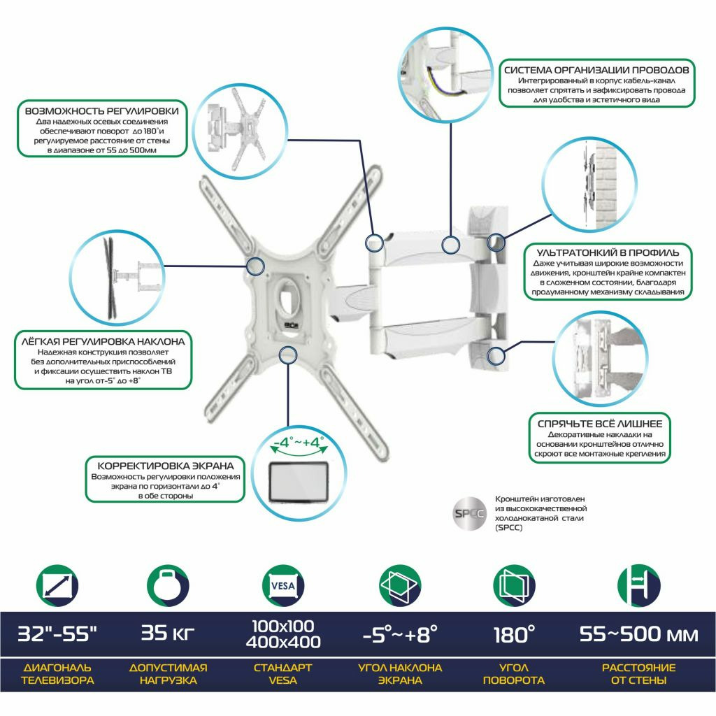 - ЛЁГКАЯ РЕГУЛИРОВКА НАКЛОНА. Надёжная конструкция без особых усилий позволит осуществить наклон даже тяжёлого телевизора лёгким движением на угол от -5 ° до +8°.