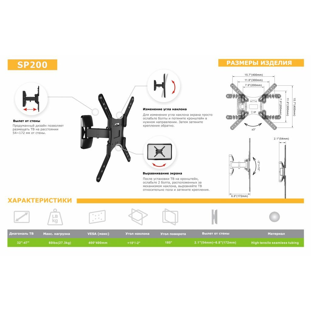 Наклонно-поворотный кронштейн SP200 отвечает высочайшим стандартам качества. Он прочен и долговечен. Настенное крепление для телевизора надежно в работе и безопасно в регулировке.