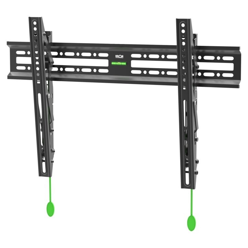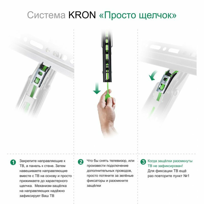 - СИСТЕМА ПРОСТОЙ ЩЕЛЧОК. Теперь есть возможность легко повесить и снять телевизор с кронштейна. Вы крепите основание кронштейна к стене и прикручиваете направляющие к телевизору, с их помощью вешаете телевизор на основание кронштейна. Теперь просто прижимайте телевизор к основанию кронштейна до характерного щелчка. Все, телевизор надежно закреплен. Чтобы снять телевизор - просто потяните вниз за зеленые фиксаторы и можно будет свободно снимать телевизор с основания кронштейна.