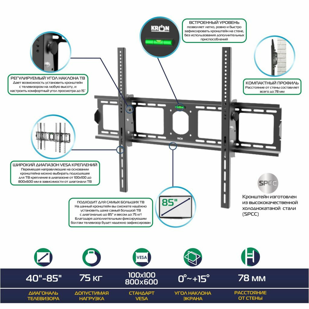 - ПОДХОДИТ ДЛЯ САМЫХ БОЛЬШИХ ТВ. На данный кронштейн Вы сможете надёжно установить даже самый большой ТВ с диагональю до 85" и весом до 75 кг! Благодаря дополнительным фиксирующим болтам, телевизор будет надёжно зафиксирован.