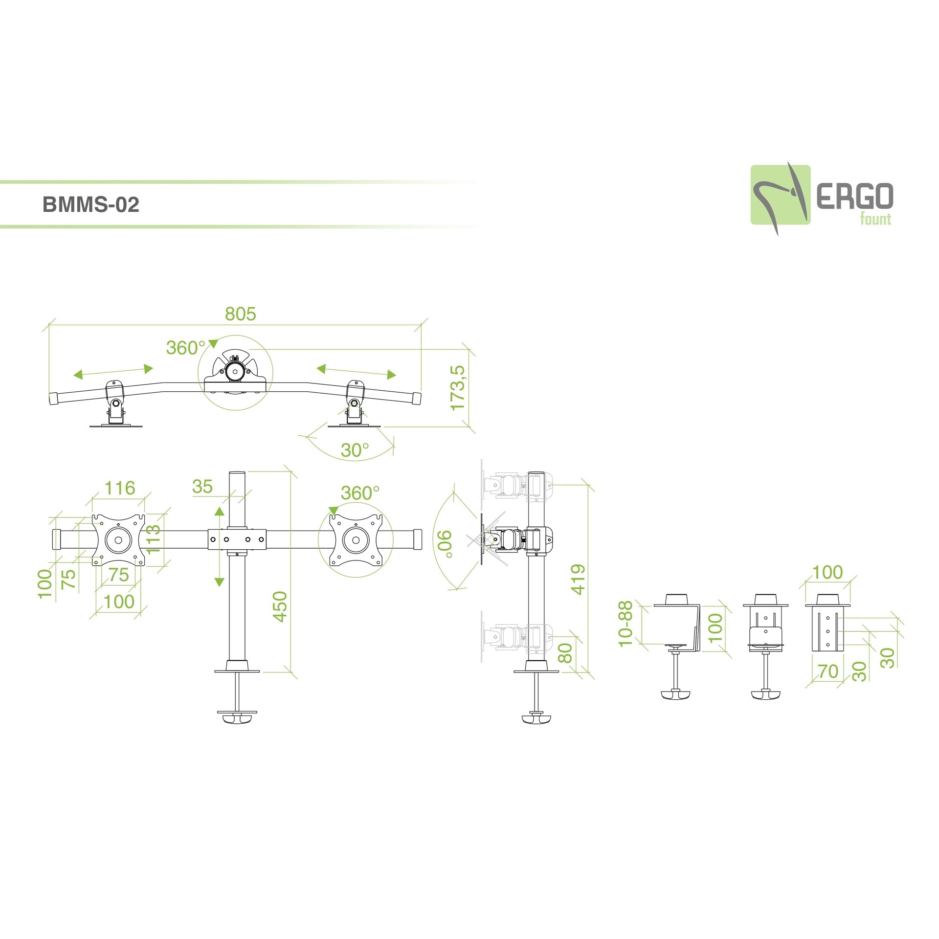 Настольное крепление для двух мониторов ErgoFount BMMS-02 отличается оптимальной подвижностью. Детали шарнирных соединений выполнены методом алюминиевого литья, что обеспечивает высокую прочность изделия, а низкий коэффициент трения создаёт эффект плавного движения. Конструкция кронштейна ErgoFount BMMS-02 позволяет разнообразно изменять положение мониторов. Крепление рассчитано для большинства жк мониторов с размерами диагонали от 15 до 27 дюймов, максимальным весом 2х6 кг.