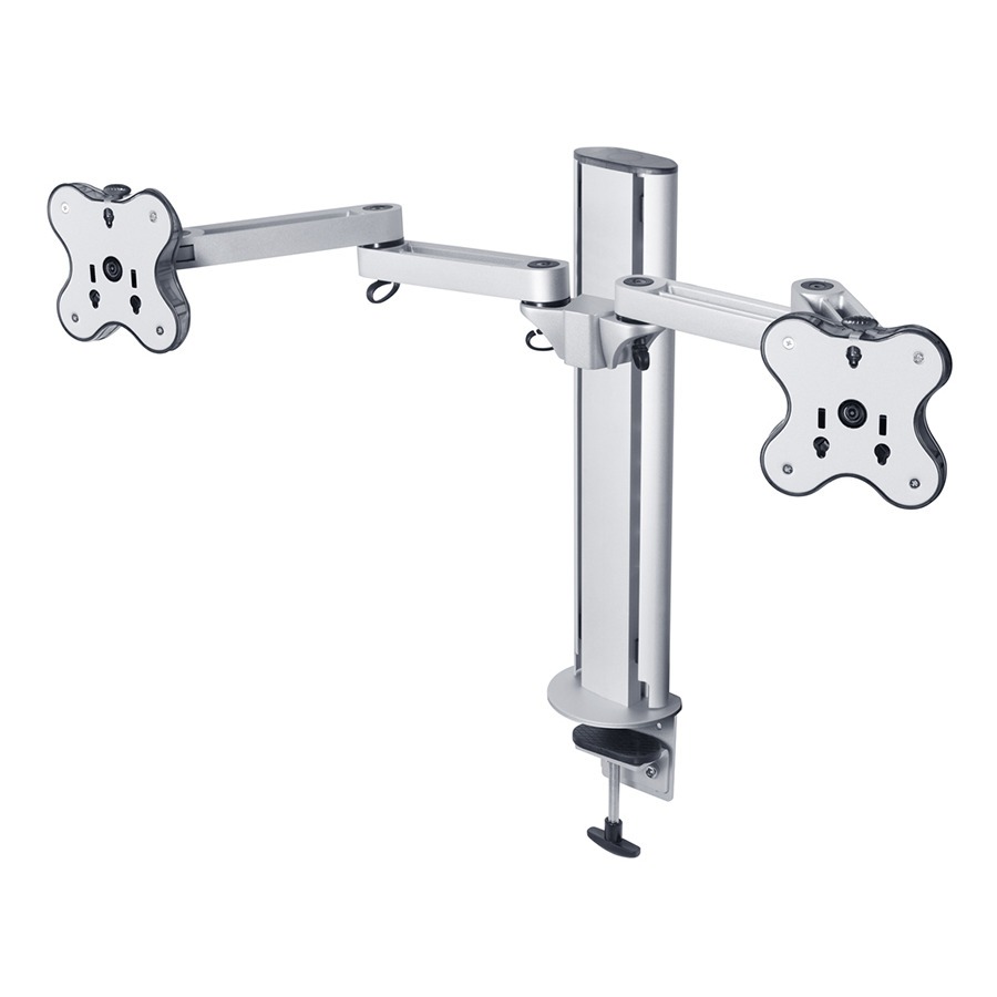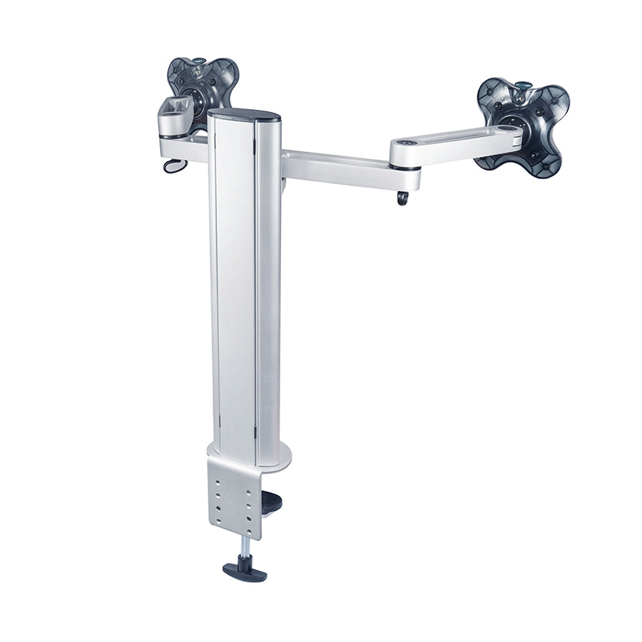 ErgoFount BTFS-202DC – настольное шарнирное крепление для 2 мониторов диагональю до 24''. Регулировка высоты в пределах 450 мм. Стандарт VESA 75х75, 100х100 мм. Количество точек поворота: 3. Количество колен: 2. Вращение: 360°. Наклон: ±30°. Поворот: ±87°. Скрытый кабель-канал в боковых частях вертикальной направляющей. Монтаж к столу: зажим типа C. Материал: алюминий, пластиковая декоративная отделка. Максимальная нагрузка: 24 кг.
