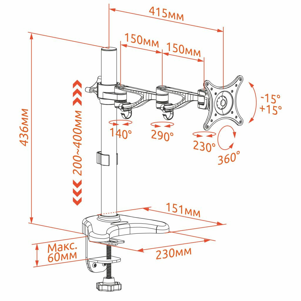 | Вылет от основания | 0~415мм |
