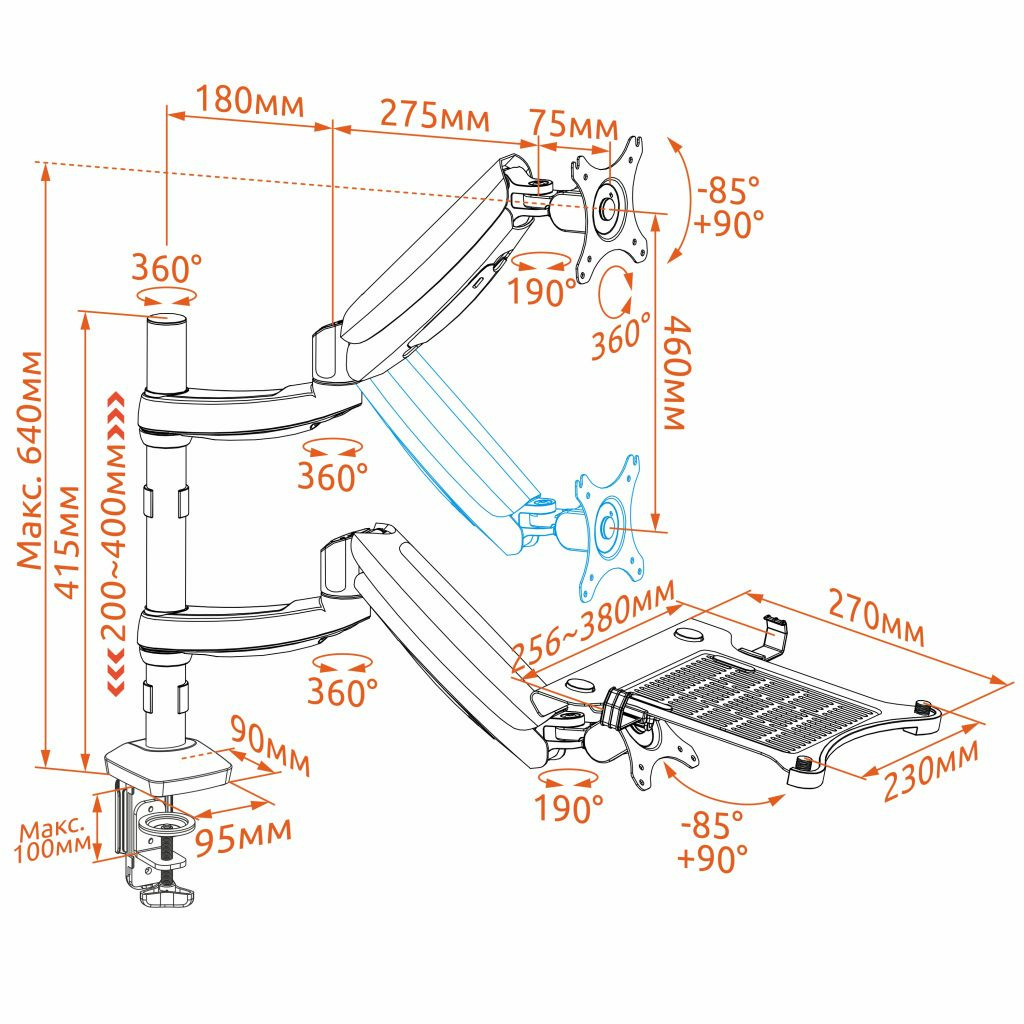 - Суммарная нагрузка до 9 кг (1,5~5кг для монитора, 0,5~4кг для ноутбука)