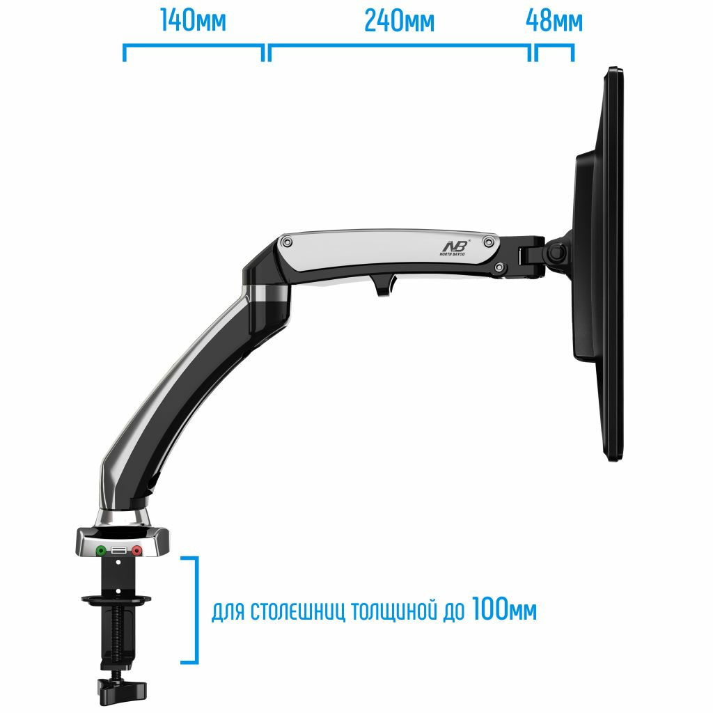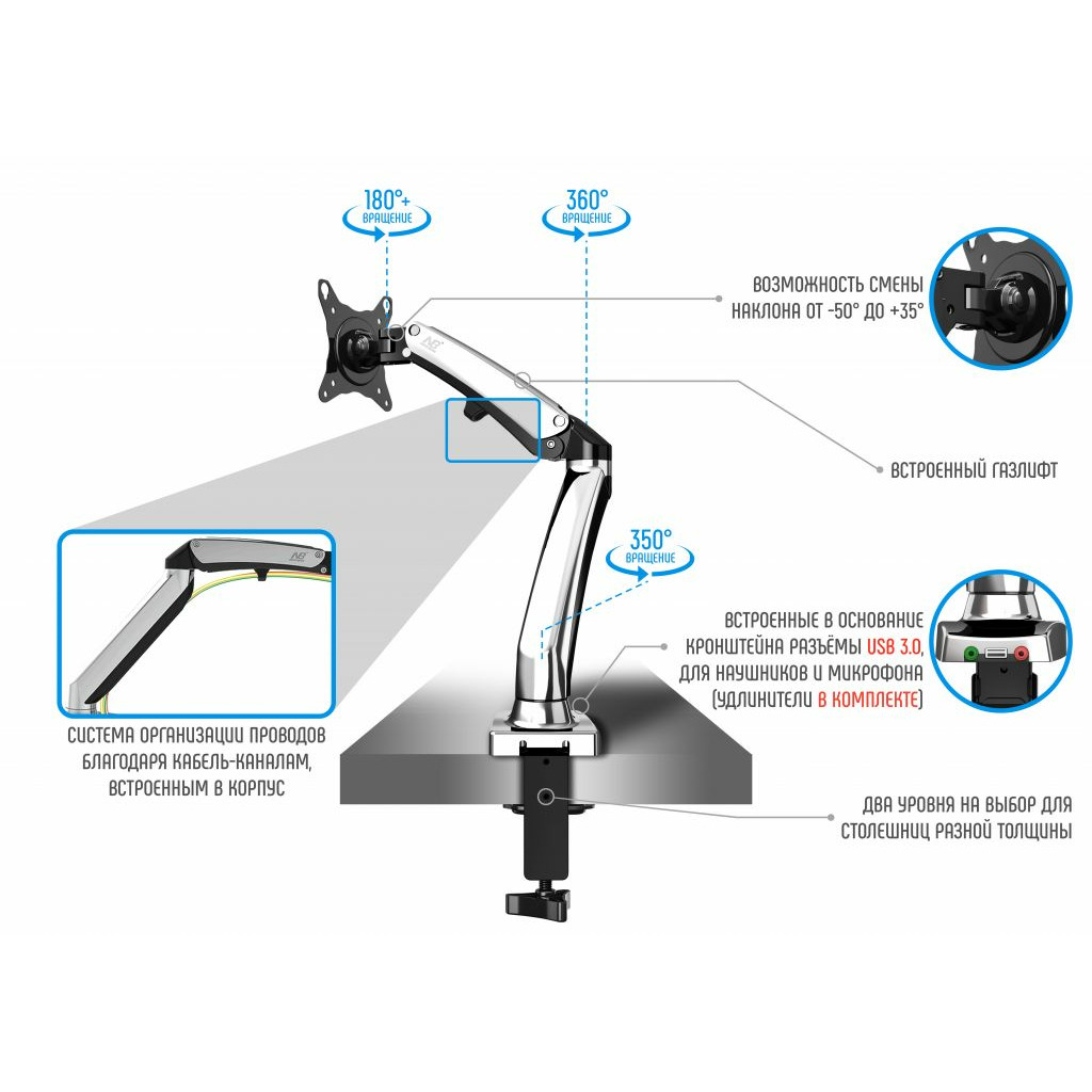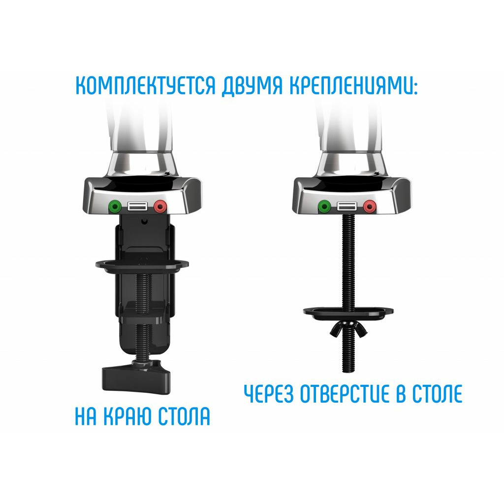 - Встроенные разъёмы для подключения USB устройств, наушников и микрофона позволяют больше не тянуть кабель от системного блока, который обычно не очень удобно располагается, а просто подключить флэшку или наушники в основание кронштейна, а уже его удлинители сигнала сделают остальное за Вас.