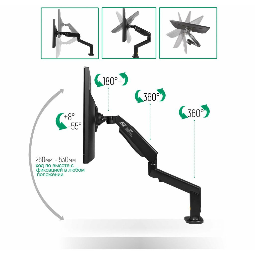 Вы сможете повернуть монитор на 360°, если существует необходимость показать изображение на экране людям напротив Вас. Возможность портретной и альбомной ориентации экрана существенно облегчит работу за компьютером. Угол наклона -8° ~ +55° позволит настроить оптимальный угол просмотра в зависимости от высоты и ширины стола, уровня освещенности помещения, и индивидуальных особенностей человека. Регулируемое расстояние от 0 до 643 мм позволяет настроить комфортное положение для работы и отдыха за компьютером. Немаловажным преимуществом является то, что Вы освободите дополнительное пространство на рабочей поверхности.
