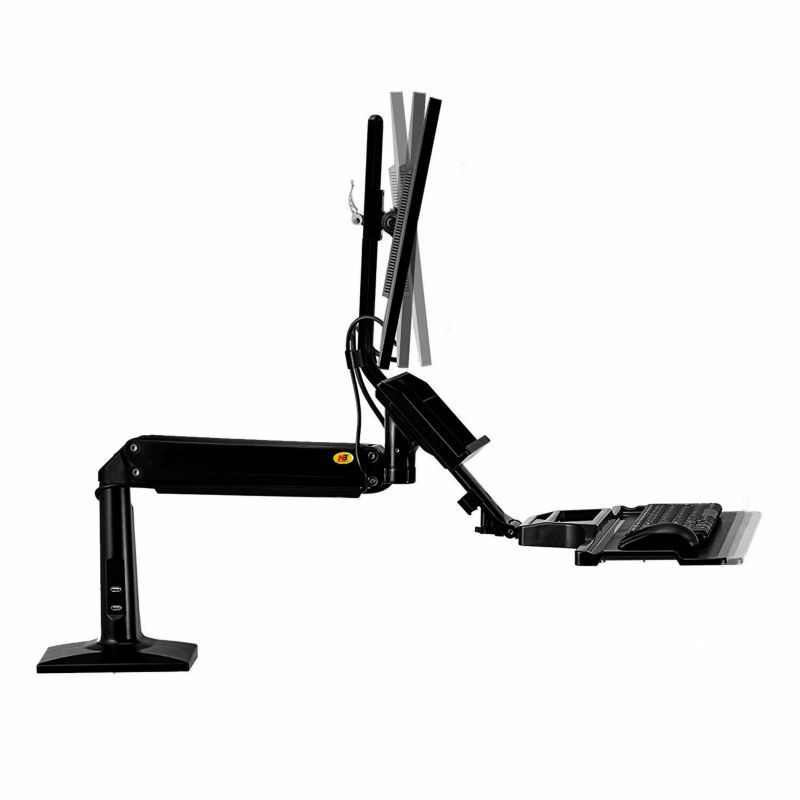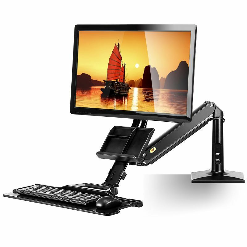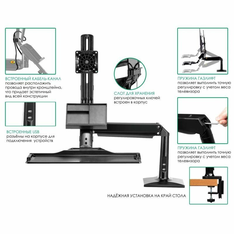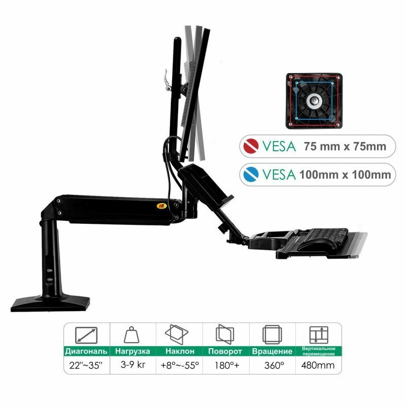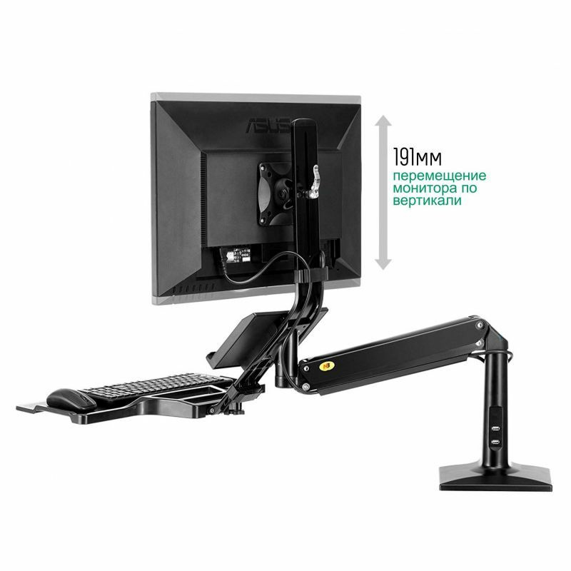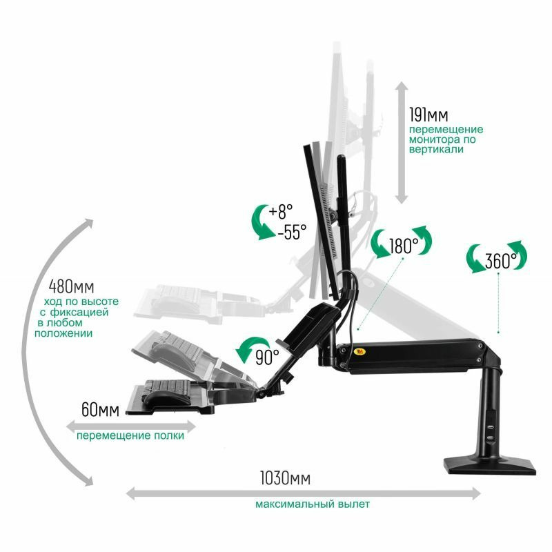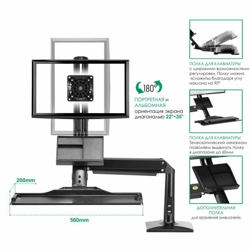 Новая конструкция позволяет установить и регулировать монитор диагональю до 35", а так же дает возможность работать в положении стоя и сидя. Немаловажным преимуществом является то, что Вы освободите пространство на рабочей поверхности, в том числе уберёрете клавиатуру. Это устройство окажется незаменимым для небольших столов или в любом месте с ограниченным пространством рабочей поверхности.