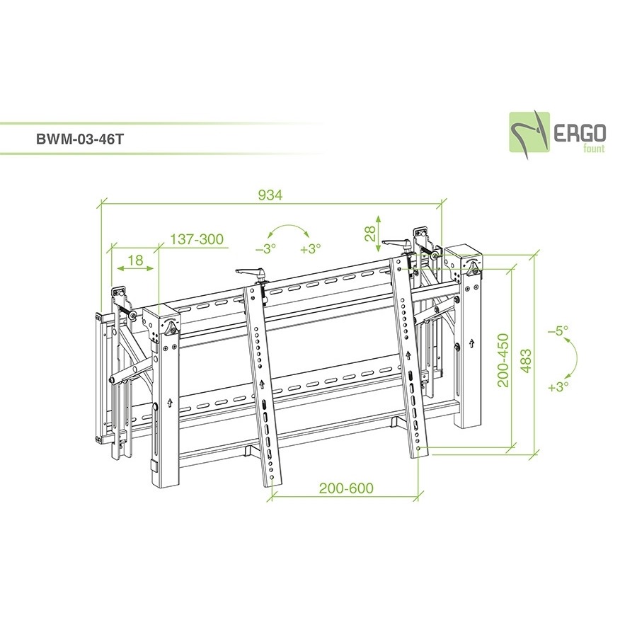 ErgoFount BWM-03-46T – настенное выдвижное крепление для построения видеостен из дисплеев диагональю 45–70''. Пружинный механизм типа push in – pop out для выдвижения. 6 точек регулировки подъема, поворота и выдвижения для идеальной настройки положения дисплея. Дисплей надежно фиксируется механизмом блокировки. Стандарт VESA 200x200...600x400 мм. Поворот: ±3° Наклон: 3...-5°. Расстояние от стены: 143–306 мм. Максимальная нагрузка: 70 кг. Цвет черный.