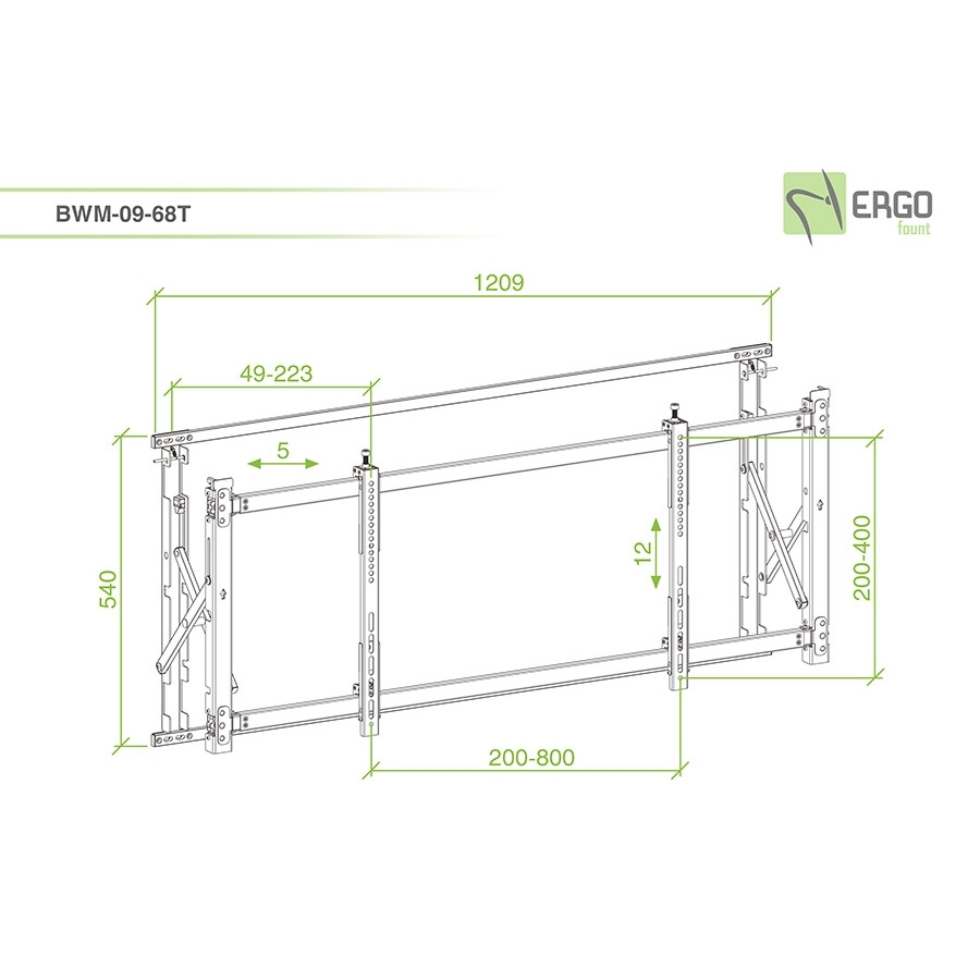 ErgoFount BWM-09-68T – ультратонкое настенное выдвижное крепление для построения видеостен из дисплеев диагональю 55–60''. Альбомная или портретная ориентация экрана. Системы регулировки для оптимальной настройки положения дисплея. Стандарт VESA 400x400...800x600 мм. Расстояние от стены: 49–223 мм. Максимальная нагрузка: 35 кг. Цвет черный.