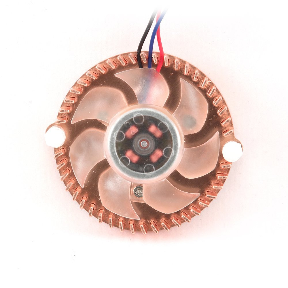 Корпус, выполненный из меди, значительно повышает качество охлаждения. Скорость вращения вентилятора составляет 5000 об/мин, напряжение питания - 12 в, а воздушный поток составляет CFM 7.79.