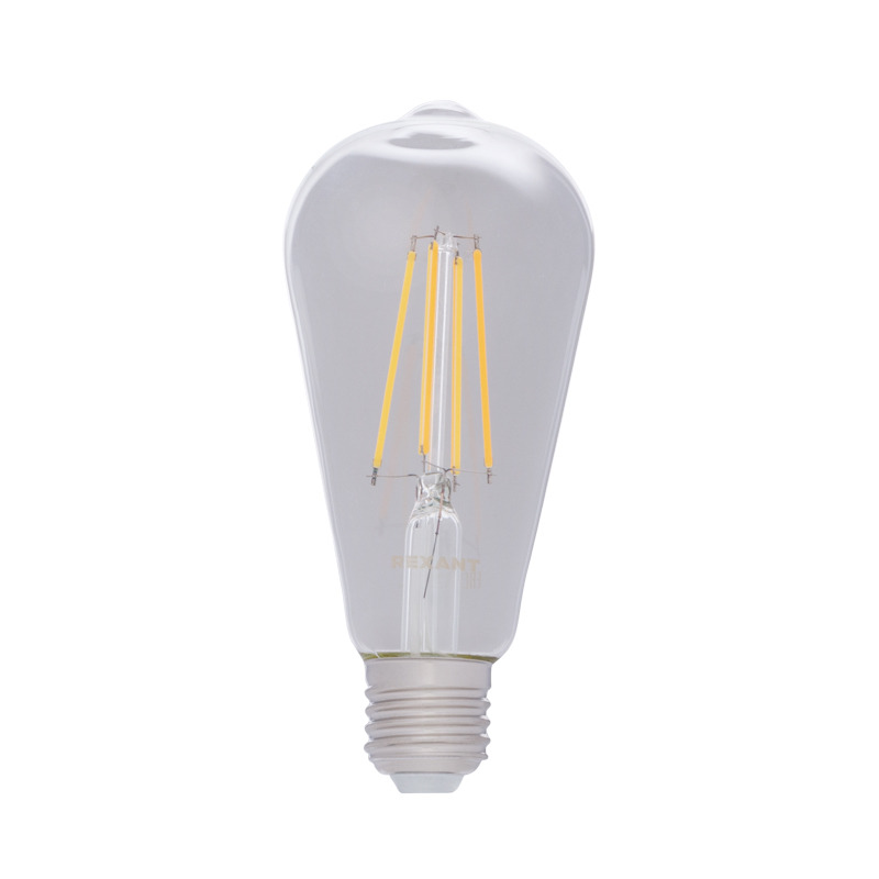 Филаментная прозрачная лампа REXANT ST64 в форме груши мощностью 11.5Вт с цоколем E27 и с теплым белым свечением в 2700K прекрасно подходит для дизайнерского освещения комнат, домов, гостиниц, кафе, и других объектов.