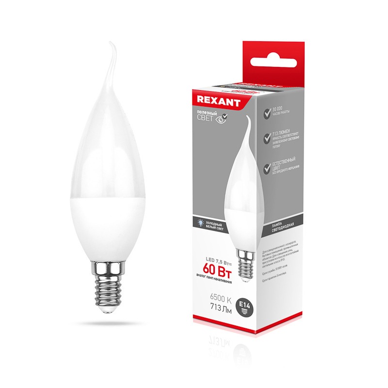 Купить лампу светодиодную Rexant 604-047 Свеча на ветру (CW) 7,5 Вт E14 713 лм 6500 K холодный свет, 10шт