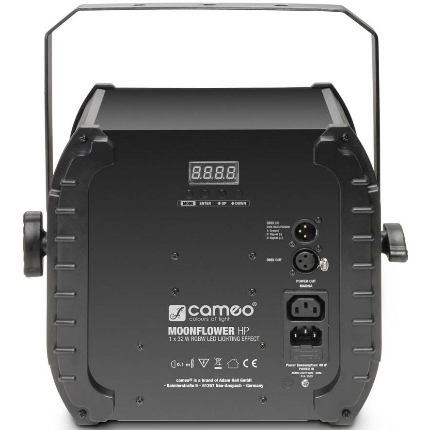 Прочный корпус из черного металла с регулируемым универсальным монтажным кронштейном оснащен 3-контактными разъемами XLR для ввода и петли сигнала DMX; Входные и выходные разъемы IEC обеспечивают параллельный источник питания последовательно соединенных устройств. Cameo MOONFLOWER HP характеризуется не в последнюю очередь низким потреблением энергии и работает со всеми сетевыми напряжениями от 100 до 240 вольт.