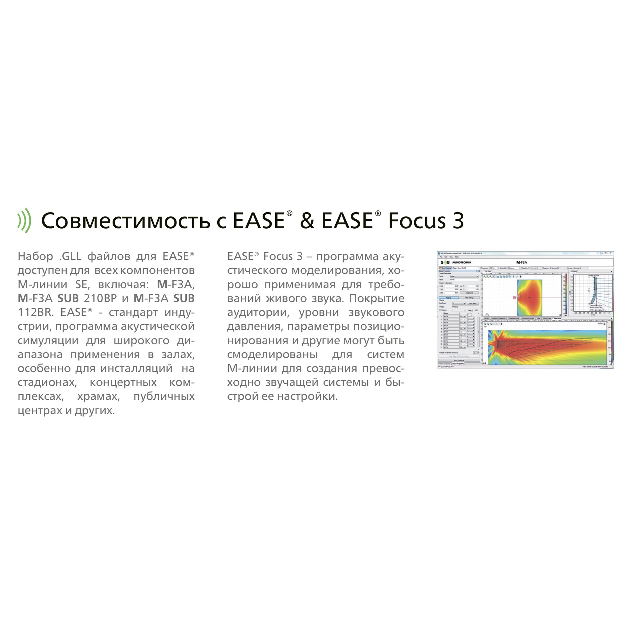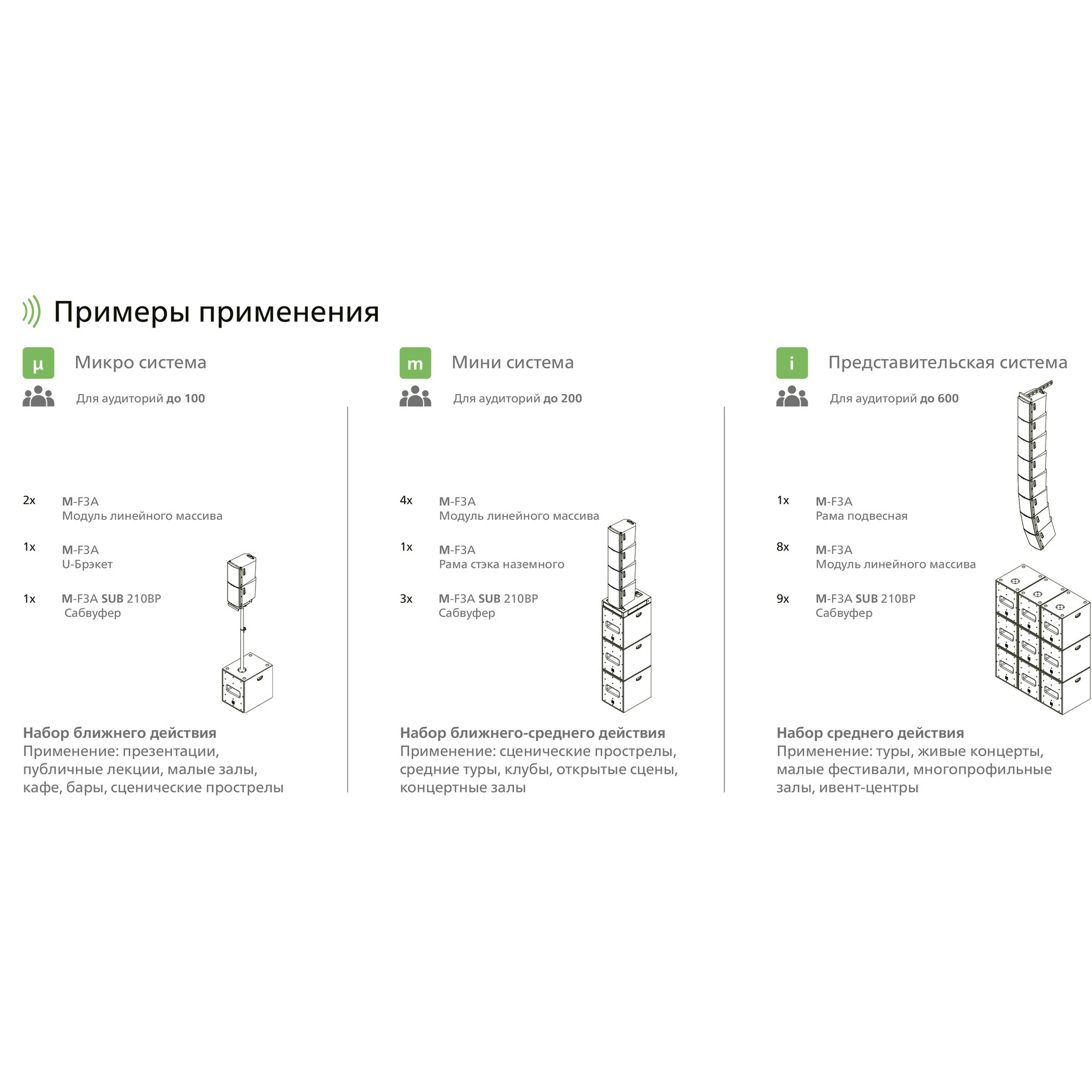 M-F3A – ультра-компактный активный модуль линейного массива, создающий кристально-чистый мощный звук с высокими частотами студийного класса и ударными средними частотами, благодаря конструкции без рупоров. Уникальный звук каждой колонки обеспечивается применением 8 высоко-эффективных средне-частотных драйверов 2.8” на неодимовых магнитах и 7 высоко-частотных купольных твиттеров 1” прямого излучения. Все динамики смонтированы на единой фронтальной панели размера печатного листа А4. Вес модуля с усилителем и процессором - всего 8 кг. Каждый модуль способен выдавать впечатляющий уровень звукового давления - 115 дБ продолжительно, в пике - до 120 дБ. Углы дисперсии в 120° по горизонтали и 16° по вертикали позволяют системе покрывать огромные зоны аудитории. Уникальное решение с единой фронтальной решеткой, закрывающей линейную сборку вплоть до 12 модулей, очень удобно на практике. Благодаря продуманному, простому и точному механизму крепления и подвеса, вы легко управитесь с ориентацией всех и каждого модуля, создавая оптимальное решение для покрытия аудитории и дальнего проброса. Разнообразие напольных сабвуферов расширяет возможности системы в области низких частот.