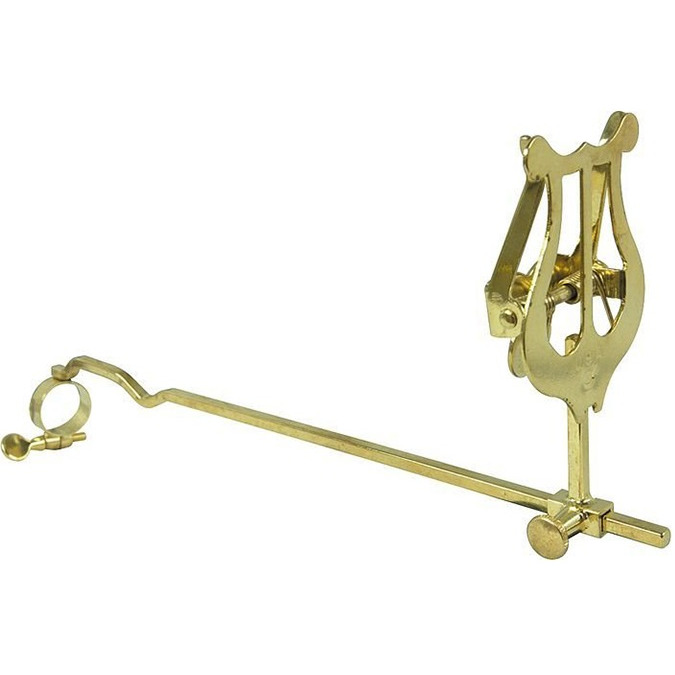Лира – это приспособление, предназначенное для установки нот на духовом инструменте или рядом с ним, позволяя всегда держать ноты перед глазами, что делает его очень полезным и даже необходимым атрибутом для музыкантов, которые играют в маршевых оркестрах. Она выполнена из металла с медным покрытием. Держатель для нот установлен на стержне квадратной формы диаметром 4 мм и длиной 210 мм. Его можно снять со стержня или двигать вдоль его для настройки наиболее оптимального расстояния. Диаметр хомута для крепления на инструмент равен 18 миллиметрам.