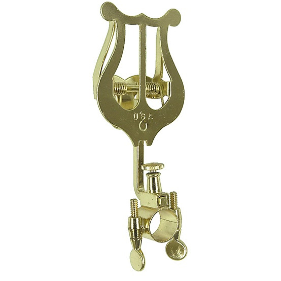 Лира – это приспособление, предназначенное для установки нот на духовом инструменте или рядом с ним, позволяя всегда держать ноты перед глазами, что делает его очень полезным и даже необходимым атрибутом для музыкантов, которые играют в маршевых оркестрах. Она выполнена из металла с позолоченным покрытием. Держатель для нот установлен на стержне квадратной формы диаметром 4 мм. Крепится лира при помощи специального хомута, который фиксируется при помощи винтовых зажимов и подходит для большинства типов труб.