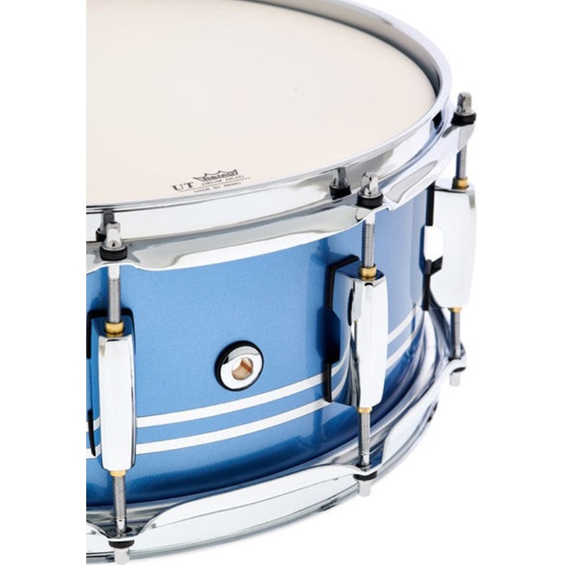 Барабаны имеют штампованные обручи SuperHoop II, стрейнер (машинка для подструнника) SR017, бриджевые лаги, стальные болты и пластики Remo.