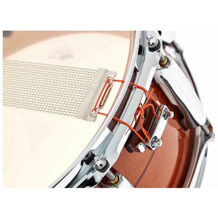 Барабаны имеют штампованные обручи SuperHoop II, стрейнер (машинка для подструнника) SR017, бриджевые лаги, стальные болты и пластики Remo.